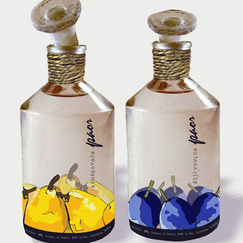 Graduate work. Bottle labels for a Serbian national alcoholic drink called Rakija. Pear rakija is called Kruskovaca. Plum rakija is called Sljivovica. Brand name is Paor.